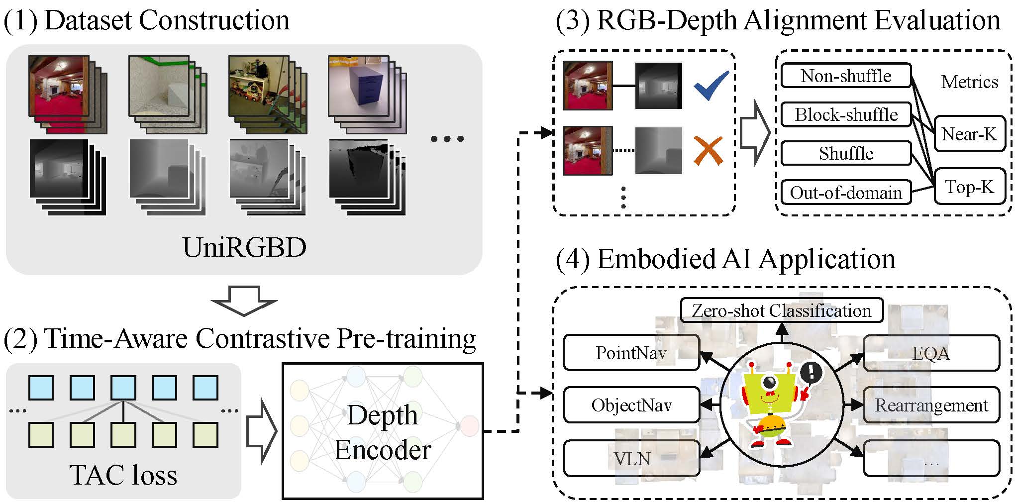 Existing end-to-end depth representation in embodied AI is often task-specific and lacks the benefits of emerging pre-training paradigm due to limited datasets and training techniques for RGB-D videos. To address the challenge of obtaining robust and generalized depth representation for embodied AI, we introduce a unified RGB-D video dataset (UniRGBD) and a novel time-aware contrastive (TAC) pre-training approach. UniRGBD addresses the scarcity of large-scale depth pre-training datasets by providing a comprehensive collection of data from diverse sources in a unified format, enabling convenient data loading and accommodating various data domains. We also design an RGB-Depth alignment evaluation procedure and introduce a novel Near-K accuracy metric to assess the scene understanding capability of the depth encoder. Then, the TAC pre-training approach fills the gap in depth pre-training methods suitable for RGB-D videos by leveraging the intrinsic similarity between temporally proximate frames. TAC incorporates a soft label design that acts as valid label noise, enhancing the depth semantic extraction and promoting diverse and generalized knowledge acquisition. Furthermore, the adjustments in perspective between temporally proximate frames facilitate the extraction of invariant and comprehensive features, enhancing the robustness of the learned depth representation. Additionally, the inclusion of temporal information stabilizes training gradients and enables spatio-temporal depth perception. Comprehensive evaluation of RGB-Depth alignment demonstrates the superiority of our approach over state-of-the-art methods. We also conduct uncertainty analysis and a novel zero-shot experiment to validate the robustness and generalization of the TAC approach. Moreover, our TAC pre-training demonstrates significant performance improvements in various embodied AI tasks, providing compelling evidence of its efficacy across diverse domains.