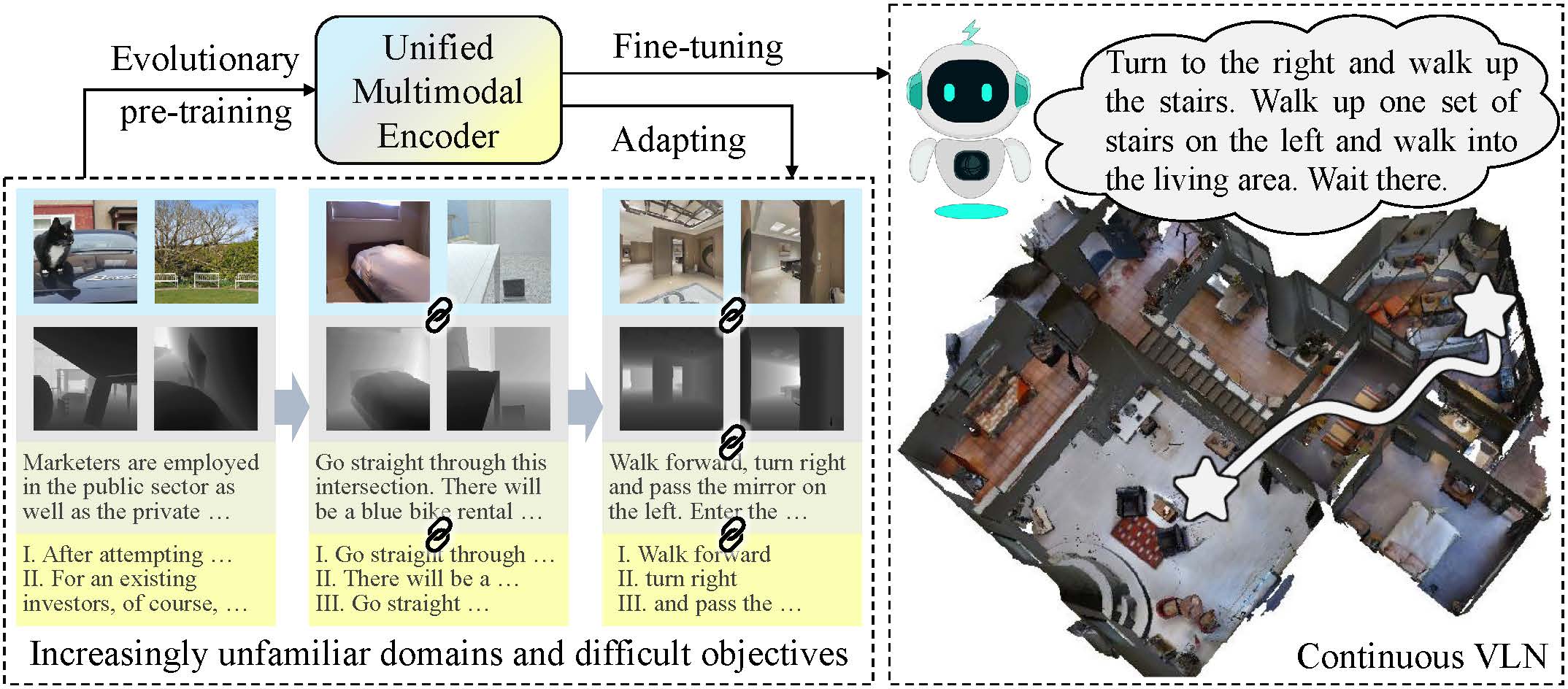 Can multimodal encoder evolve when facing increasingly tough circumstances? Our work investigates this possibility in the context of continuous vision-language navigation (continuous VLN), which aims to navigate robots under linguistic supervision and visual feedback. We propose a multimodal evolutionary encoder (MEE) comprising a unified multimodal encoder architecture and an evolutionary pre-training strategy. The unified multimodal encoder unifies rich modalities, including depth and sub-instruction, to enhance the solid understanding of environments and tasks. It also effectively utilizes monocular observation, reducing the reliance on panoramic vision. The evolutionary pre-training strategy exposes the encoder to increasingly unfamiliar data domains and difficult objectives. The multi-stage adaption helps the encoder establish robust intra- and inter-modality connections and improve its generalization to unfamiliar environments. To achieve such evolution, we collect a large-scale multi-stage dataset with specialized objectives, addressing the absence of suitable continuous VLN pre-training. Evaluation on VLN-CE demonstrates the superiority of MEE over other direct action-predicting methods. Furthermore, we deploy MEE in real scenes using self-developed service robots, showcasing its effectiveness and potential for real-world applications. Our code and dataset are available at https://github.com/RavenKiller/MEE.