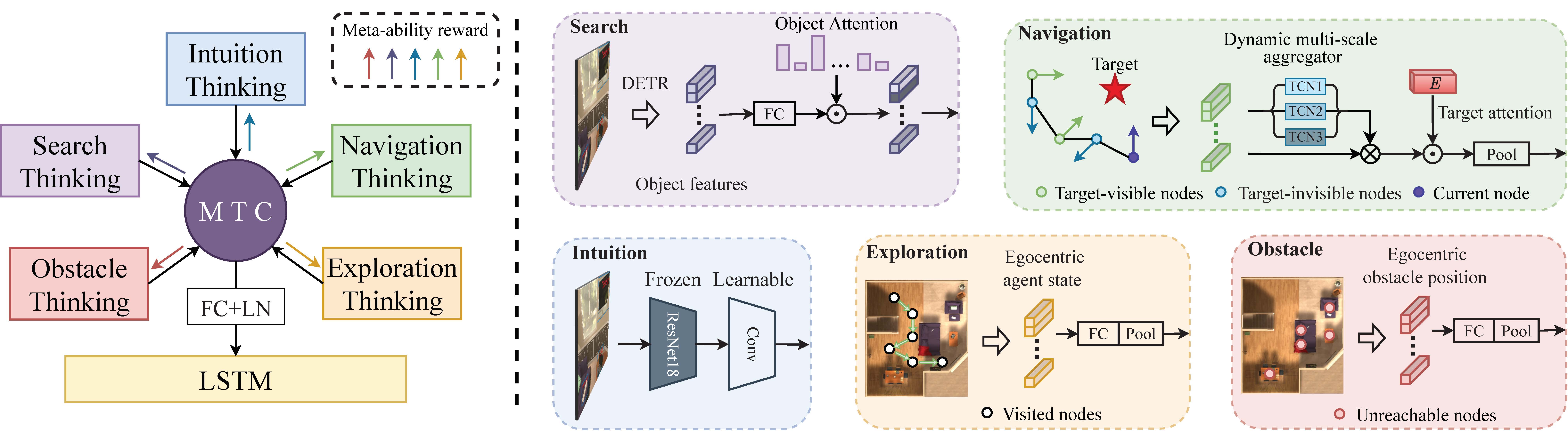 We propose a meta-ability decoupling (MAD) paradigm, which brings together various object navigation methods in an architecture system, allowing them to mutually enhance each other and evolve together. Based on the MAD paradigm, we design a multiple thinking (MT) model that leverages distinct thinking to abstract various meta-abilities. Our method decouples meta-abilities from three aspects: input, encoding, and reward while employing the multiple thinking collaboration (MTC) module to promote mutual cooperation between thinking. MAD introduces a novel qualitative and quantitative interpretability system for object navigation. Through extensive experiments on AI2-Thor and RoboTHOR, we demonstrate that our method outperforms state-of-the-art (SOTA) methods on both typical and zero-shot object navigation tasks.